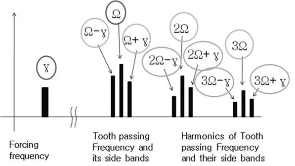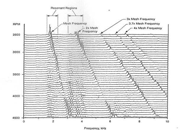 기어 상자 내부로부터 발생되는 가진주파수는 기어 쌍 마다 하나씩 발생되는 물림주파수와 그의 하모닉과 시변 치 강성계수의 조화결합으로 부터 파생되는 사이드 밴드들이 다수 발생하기 때문에 캠벨 다이아그램을 통하여 공진 여부를 파악하여야 한다.
