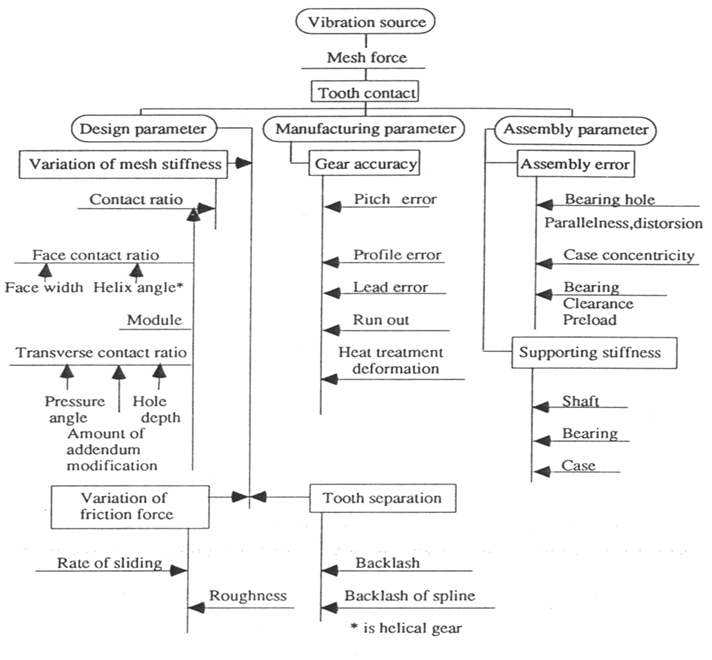 설계 요인으로선 기어 강성이 변하고, 제조 요인으로 기어 정도가 달라지며, 조립 요인에 의해 조립 오차가 발생하여 이빨의 맞물림 충격 등의 진동을 일으킨다.