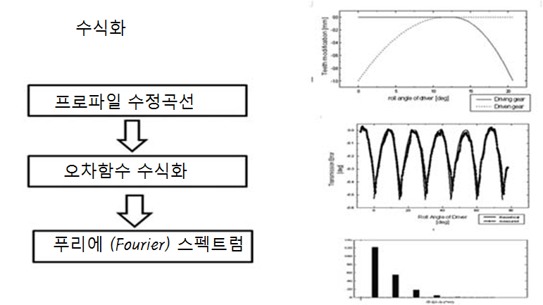 이 전달 오차는 축의 회전과 기어 맞물림 주파수에 관련이 있는 기본적인 주기성을 가지고 있어서 전달오차의 푸리에(Fourier) 변환으로부터 얻을 수 있는 맞물림 주파수와 그의 하모니(Harmonic)은 기어 소음에 유용한 정보를 제공한다.
