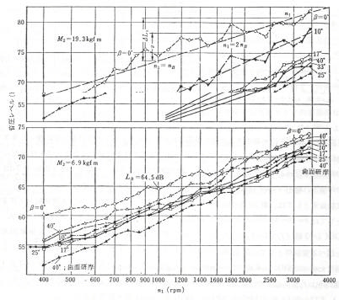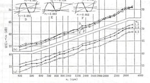 x1=x2=0.5 인 세가지의 기어에 대해서 실험한 결과를 보면, 전위량 및 압력각이 변화하였을 때, 또는 전위에 의하여 미끄럼 속도가 변화하고 동시에 치강성이 변화하였을 때 음압 레벨의 변화가 거의 변화가 없다.