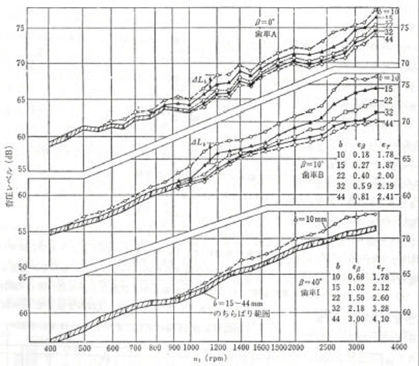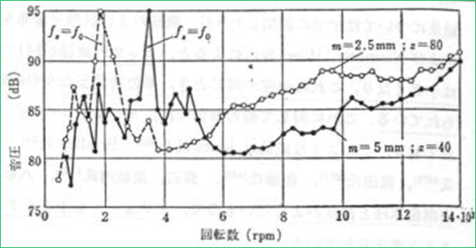 이상의 고찰에 관련해서 치폭이 큰 기어는 공진 주파수가 높으며 그 회전속도 영역이 비교적 넓다.