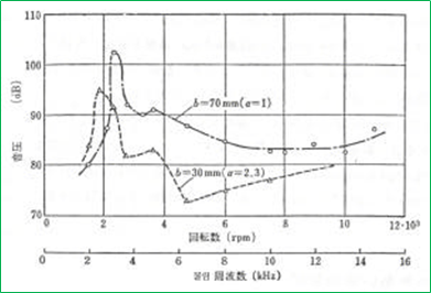 b=30 mm 일 경우에는 70mm인 기어에 비해 단위 치폭당 작용하중이 2.3배 정도가 걸림에도 불구하고 고속영역에서의 소음이 작아지며 속도가 증가할수록 그 차는 적어진다